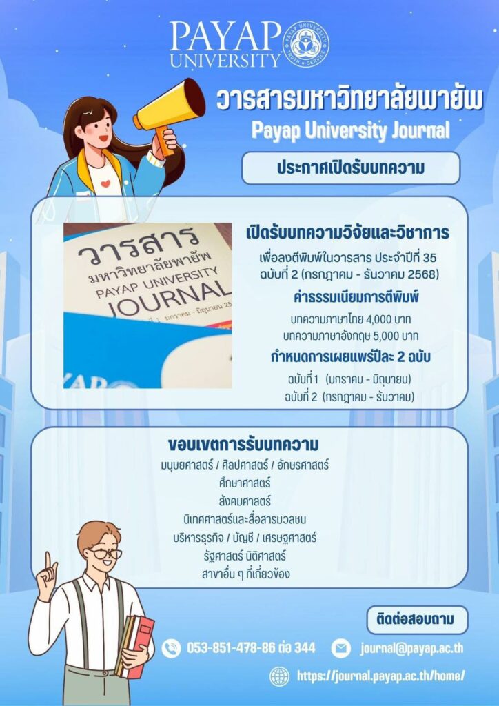 📌เชิญชวนอาจารย์ นักวิจัย และผู้สนใจส่งบทความวิจัย I บทความวิชาการ เพื่อเผยแพร่ลงวารสารมหาวิทยาลัยพายัพ ปีที่ 35 ฉบับที่ 2 (กรกฎาคม – ธันวาคม 2568)